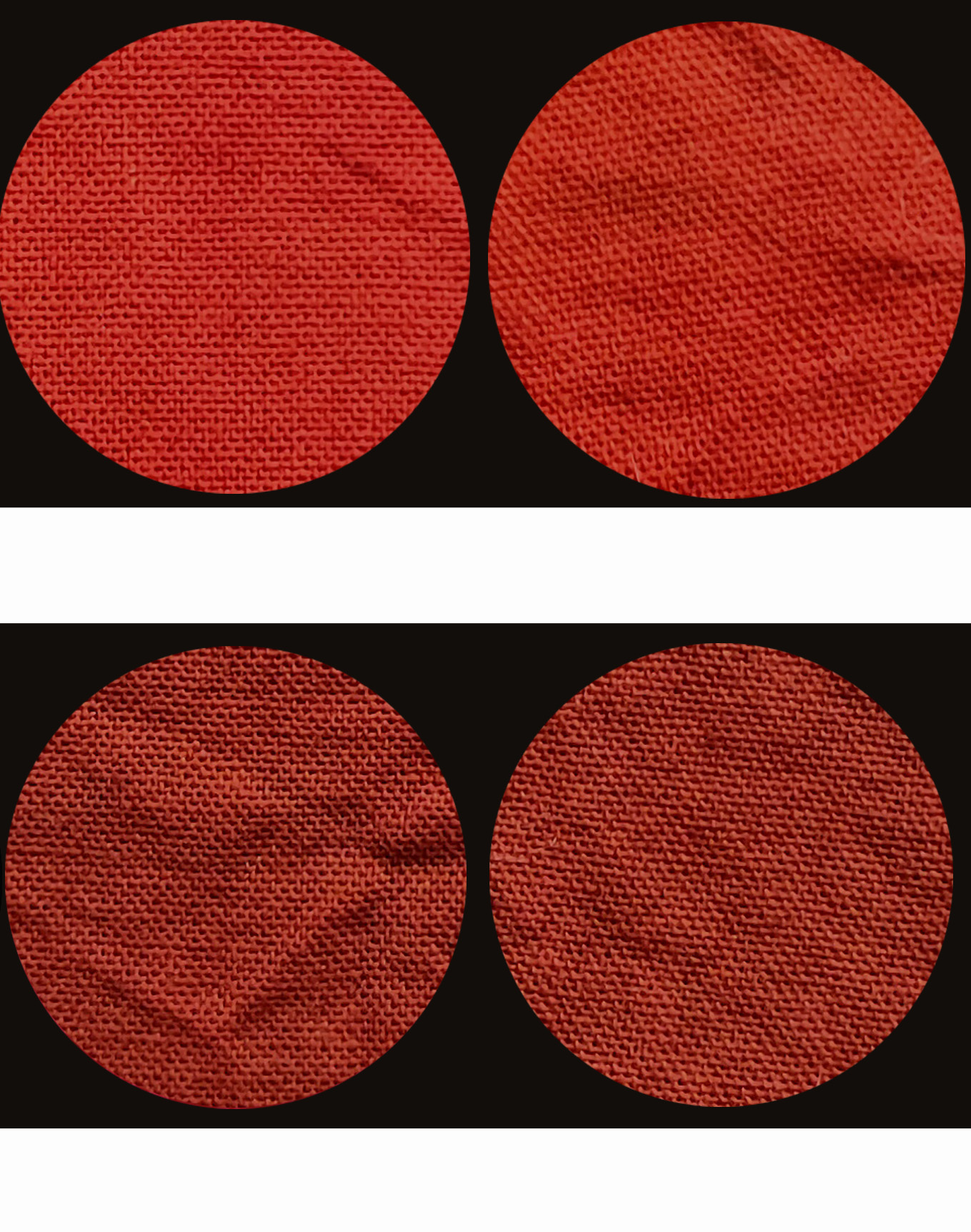 The second row is the same experiment with an additional step. After the cotton was taken out of the solar bath I gave it a quick rinse and then submerged it into some iron water for 30seconds. This gives you a lovely darker brown red.