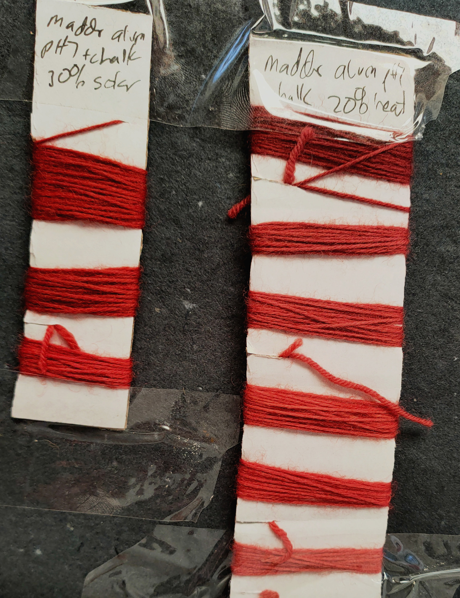 Today we will be looking at one of the reds that can be achieved by naturally dyeing with madder. In these experiments we will be using alum mordant and a neutral pH of 7.
